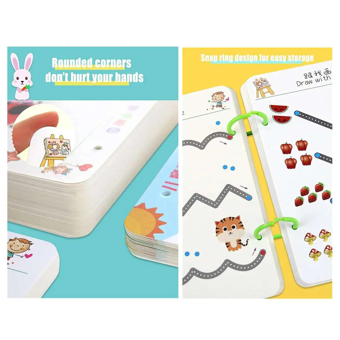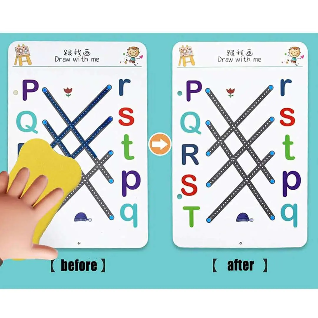 Incluye 64 hojas reutilizables donde los peques pueden practicar letras, números, figuras y trazos. Solo deben escribir con el marcador mágico y luego borrar para volver a empezar. Ideal para desarrollar la motricidad fina y la escritura temprana.
