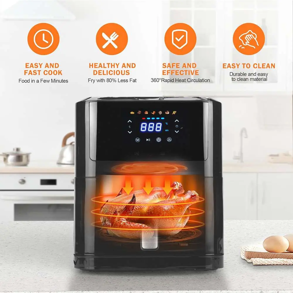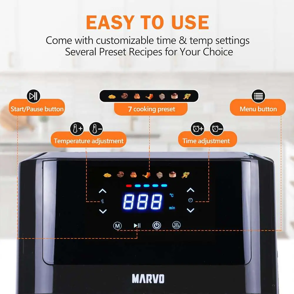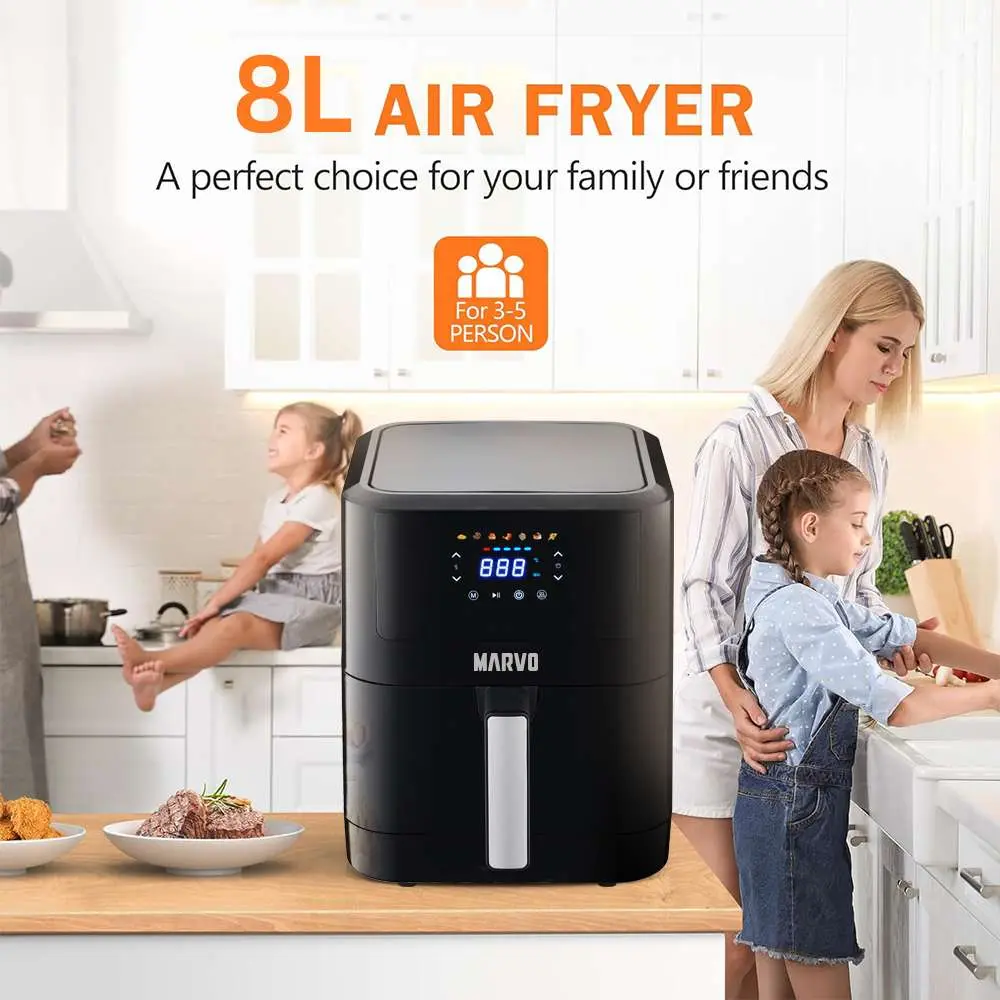 Disfrutá de comidas más saludables y sabrosas con la Freidora sin Aceite Marvo de 8 litros. Su avanzada tecnología de aire caliente te permite cocinar con hasta un 80% menos de grasa, manteniendo el sabor y la textura crujiente de tus platos favoritos. Con su amplia capacidad, es ideal para familias o reuniones, y gracias a su panel digital táctil con 7 programas automáticos, cocinar nunca fue tan fácil. Además, incorpora temporizador de 60 minutos, control de temperatura ajustable y un sistema de apagado automático que garantiza seguridad y practicidad en cada uso. Una solución moderna, eficiente y elegante para tu cocina.