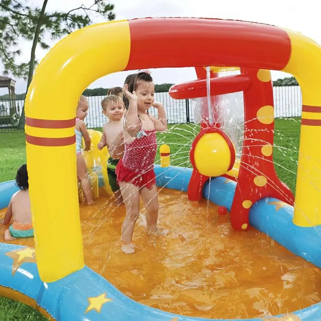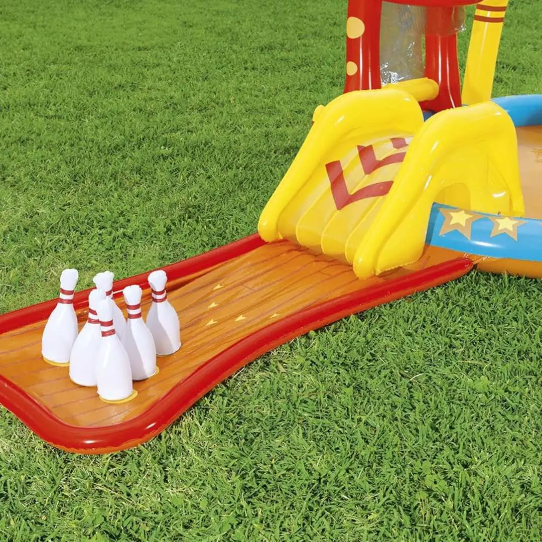 Piscina interactiva, centro de juegos infantil. Con suelo inflable para mayor comodidad de los pequeños. Incluye seis bolos, un aro y dos anillas. Tiene un tobogán extraíble y un pulverizador rotatorio para que los niños puedan refrescarse mientras se divierten. Medidas: 435x213x117cm. Está fabricada con vinilo resistente y probado. Con válvulas de seguridad.